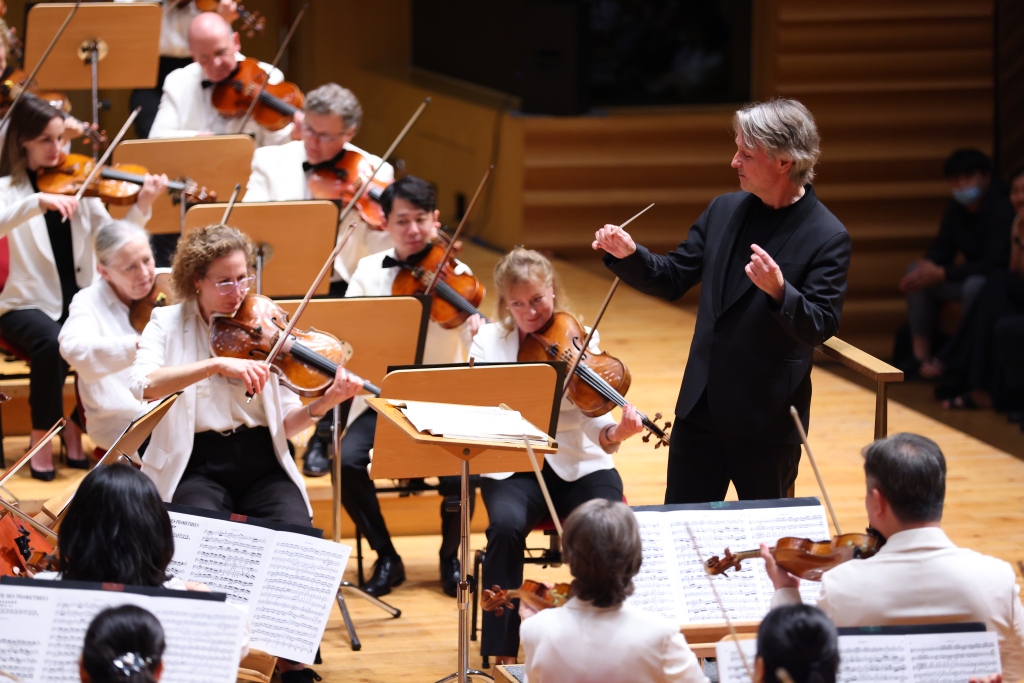 最后一首曲子的赋格本来应该是万马齐的,但是萨洛宁却做了声学结构示范课。在双簧管以强奏吹出主题时,第二小提琴组立即以弱奏重复呼应,声部叠加如立体几何模型。在第二个主题中,我看到萨洛宁的左手突然握紧了——开始“手把手”地控制弦乐的强弱,真的是一个大师班的场景。最激进的时刻在最后一段:圆号手高高地将号码提升到45度,这是英雄主义最生动的写照。