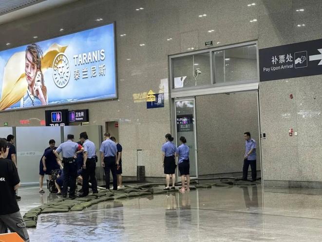 19点25分,记者前往成都东站,发现到达地板上有很多水。工作人员用沙袋垫出路,供到达车站的乘客离开车站,水边被防洪沙包围。与此同时,一些工作人员使用抽水机、雨刷等工具积极排水,以确保操作。