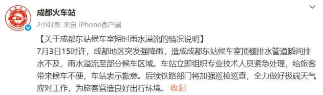 对于这一点,@成都火车站 官方微博回应:7月3日15时许,成都突然下水,导致成都东站候车厅天花板排水管瞬间排水不佳,雨水溢出部分候车区。车站立即组织专业技术人员进行紧急处理,给乘客带来候车不便,车站道歉。后续铁路部门将加强巡检,全力以赴应对恶劣天气,为乘客创造良好的出行环境。