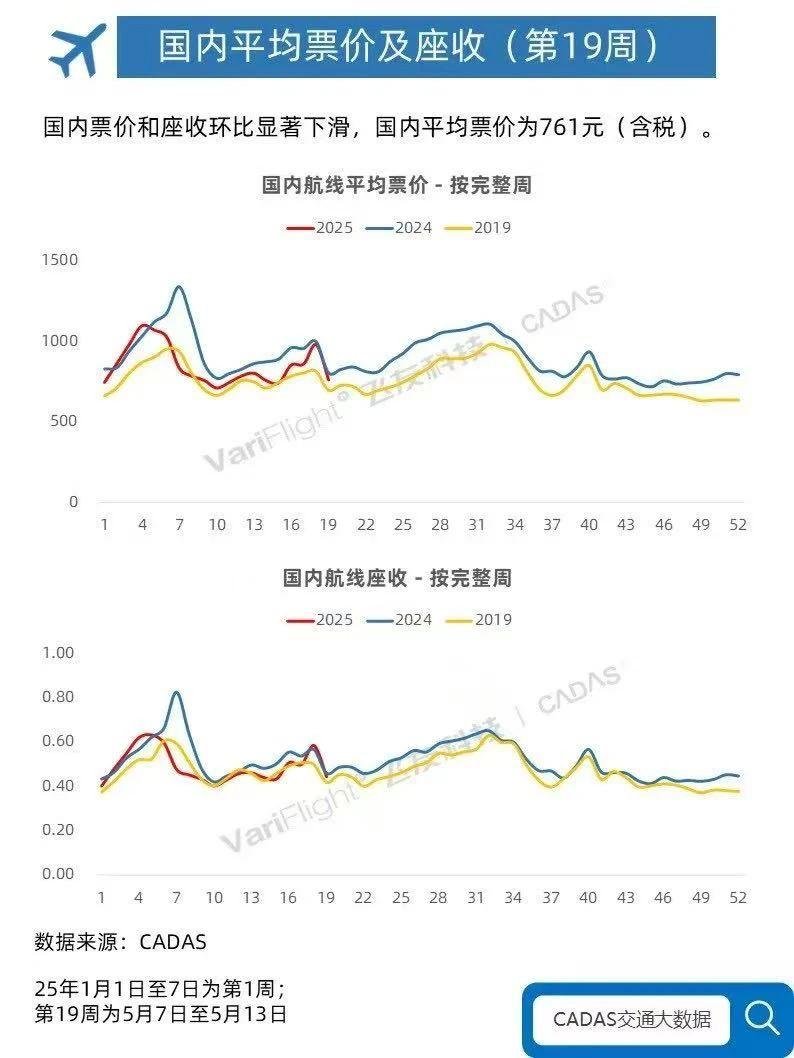 在此前提下,根据2024年和2025年初的数据,全国民航旅客吞吐量已经恢复,超过疫情前的水平,客座率也在上升。然而,“旺丁不富裕”的趋势仍在继续,机票价格无法提高。根据CADAS交通大数据发布的数据,2025年以来,国内航线平均价格低于2024年同期水平,与2019年相比波动不明显。