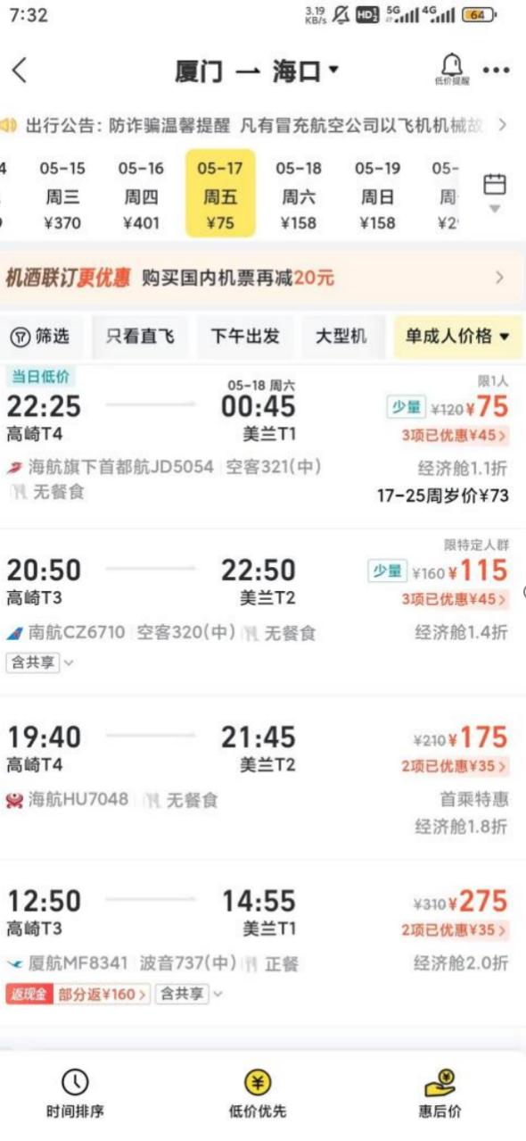 以2025年春节假期后的机票价格为例。杭州、上海、北京、南京等地出发飞往成都的最低价格保持在200元左右,昆明、长沙、贵阳、海口等成都出发的2月价格也低至200元以上。2024年五一假期后,海航厦门飞海口的机票低至75元,南航、厦航的机票也在100-200元之间波动。
