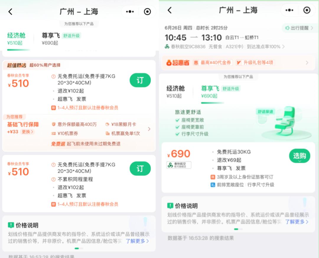就拿6月26日广州飞上海来说,超惠飞的机票价格是510元,而专属飞的机票价格是690元,两者相差180元,但是专属飞的乘客可以享受30KG免费托运的行李服务,提升行李尺寸,同时坐椅也会更高,而经济舱的乘客,不仅没有免费托运,而且行李尺寸必须保持在20x30x40CM,而且重量不能超过7KG。
