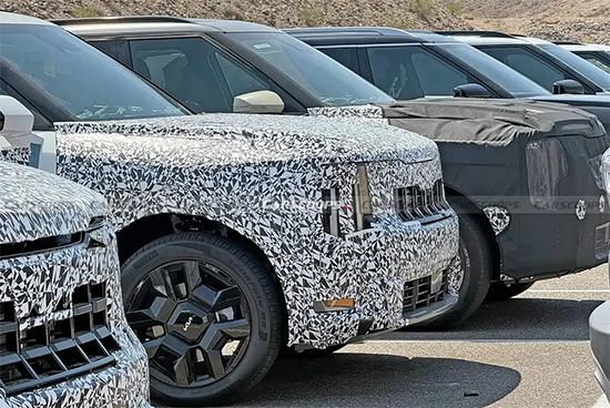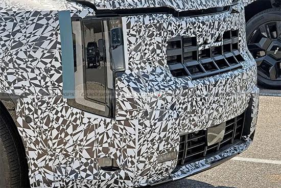 从这次曝光的谍照来看,测试车被厚厚的伪装包裹着,但可以清晰地看到宽大的轮廓和笔直的车身线条,符合大尺寸 SUV 定位,充满气场。细节方面,前进气格栅采用黑色网状风格,左右两侧垂直排列大灯,营造出既有动感又有硬核的视觉效果。