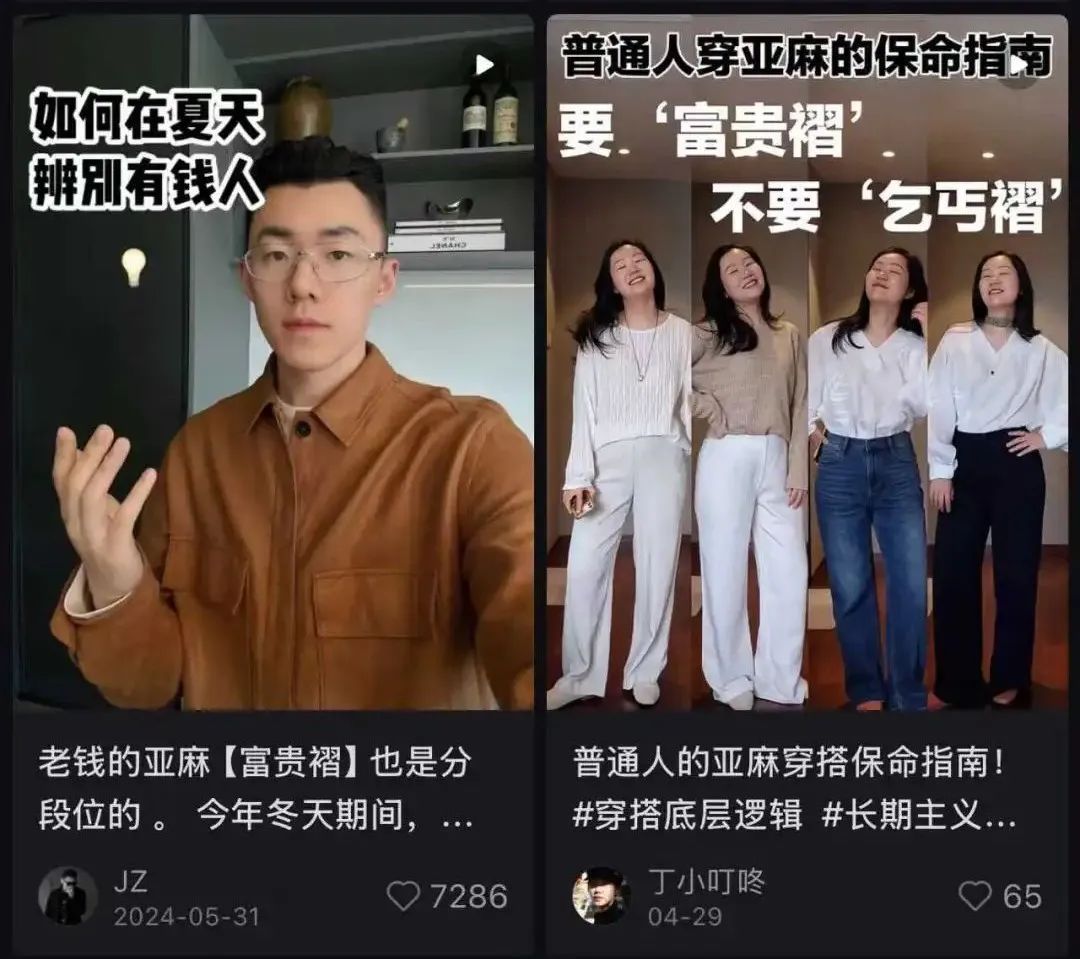 亚麻,由于其“不讨好任何人”的放松姿态,成为经济上风穿搭的典范,成为网络富人的象征。