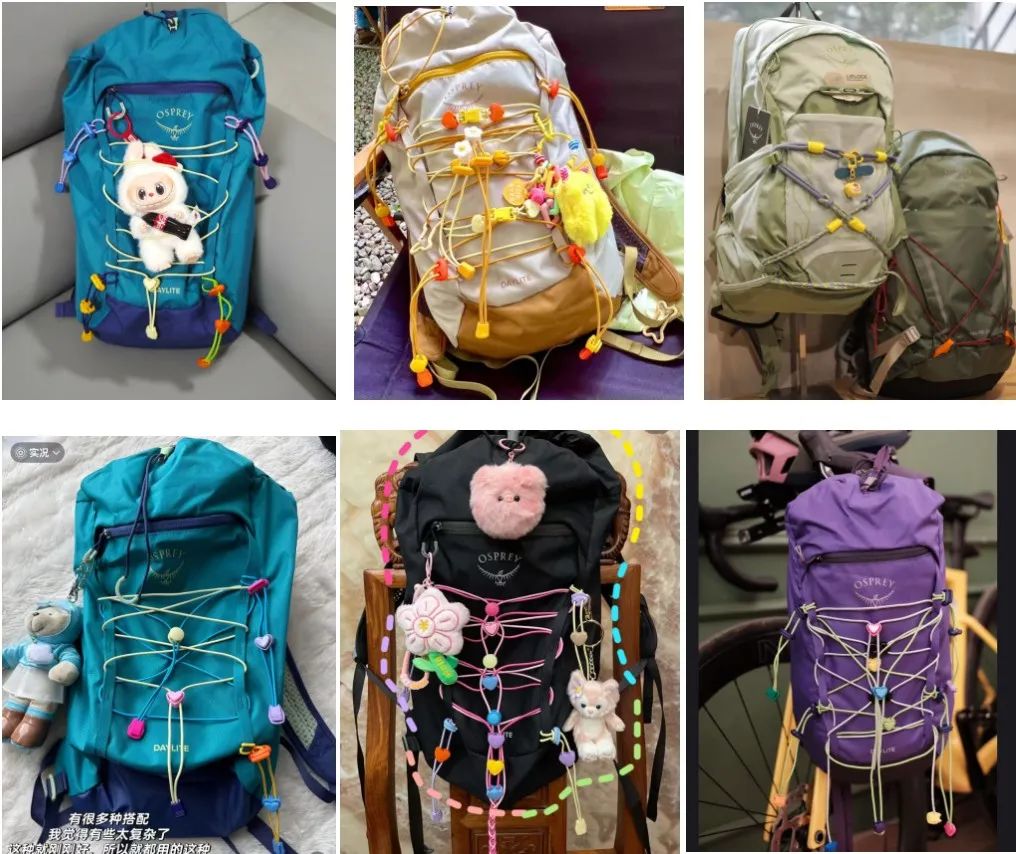 小鹰背包的多巴胺甜妹风在小红书很受欢迎。基于弹力绳的设计和多彩的配色,小鹰的 DIY 这是一个巨大的空间,女性用户通过改变包包来展示自己的个性和对时尚的态度,这和女孩子一样 SD 娃娃梳洗打扮,买 Labubu 要配娃衣,买 Crocs 洞鞋要搭配花瓣饰品是基于相似的想法。