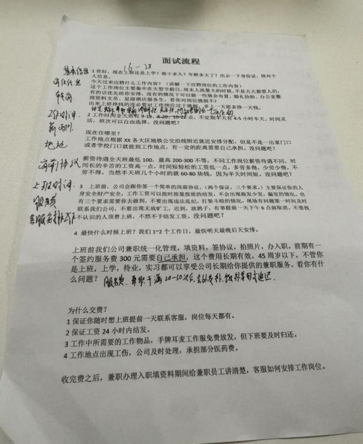 “第一次找日结,还没赚到钱,就贴了300块。”前期,叶菱在招聘网站上看到一份非常激动人心的日结工作。线下面试结束后,对方要求签订协议并支付300元的服务费,并承诺长期提供兼职工作。叶菱没多想就付了钱。出门越想越不对劲。在网上搜索后,他发现这是一个常见的骗术。