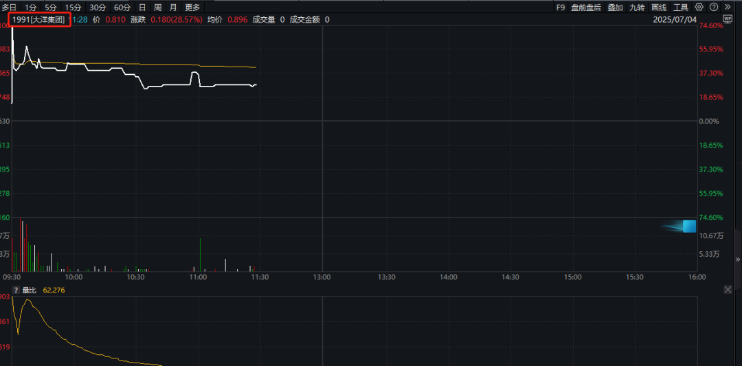 在港股市场大幅波动的股票中,大洋集团暴涨,盘中暴涨近75%。