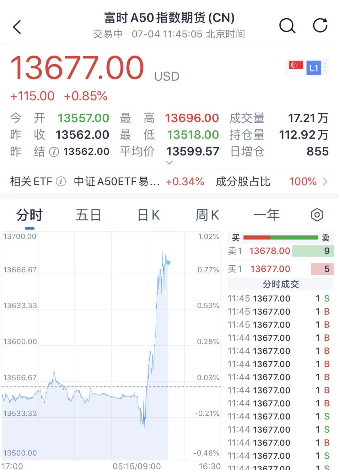 富时A50指数期货盘也在拉升,现在已经上涨了近1%。