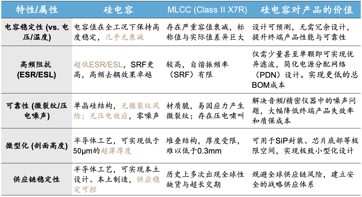 传统MLCC采用陶瓷粉末未堆叠烧结工艺,存在先天不足:瓷器固层容易出现微裂纹,高温烧结会导致内部应力堆积,多层结构会带来高寄生电感。硅电容的单晶硅基具有高度有序的原子排列和无晶界缺陷,从根本上解决了这些问题。