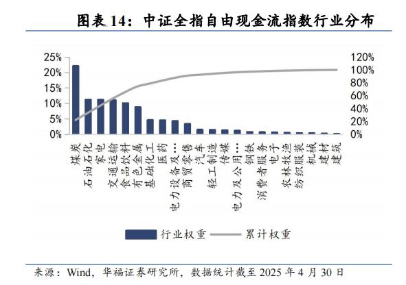 在行业分布方面,CSI现金流指数呈阶梯状,煤炭企业占20%以上,石油石化、家电、交通、食品工业、有色金属等领域占10%左右,4个行业占5%左右,其他行业占比较低。