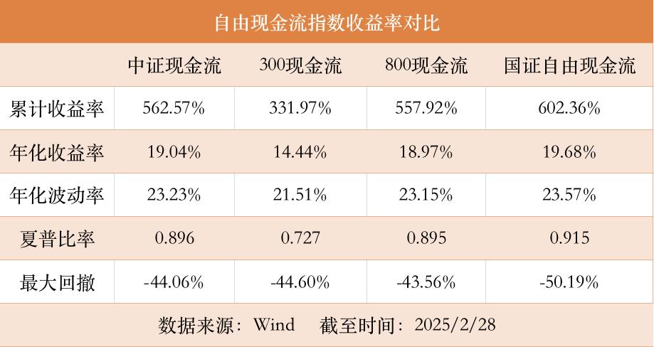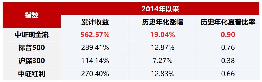 据Wind数据显示,从2013年12月31日到2025年2月28日,中证现金流指数累计收益率达到562.57%,年化收益为19.04%,高于沪深300现金流和立证800现金流指数。