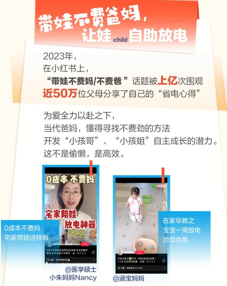 从数据中我们也可以看出,这种心态并不少见。《小红书父母观察报告》指出,平台上只有一年就有上亿个关于“照顾宝宝不消耗妈妈/爸爸”的话题。