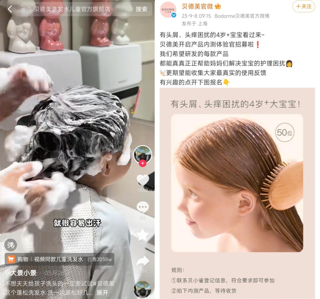 另外,贝德美擅长以小创新的方式与用户互动,并留下继续吸引用户的钩子。比如贝德美招募了一万名成分体验官,邀请宝妈们参加新品香型和包装设计投票;比如贝德美在公园场景中设置了一个洗漱体验角,每天有2000多组家庭参与体验,加深了互动中的品牌认知。