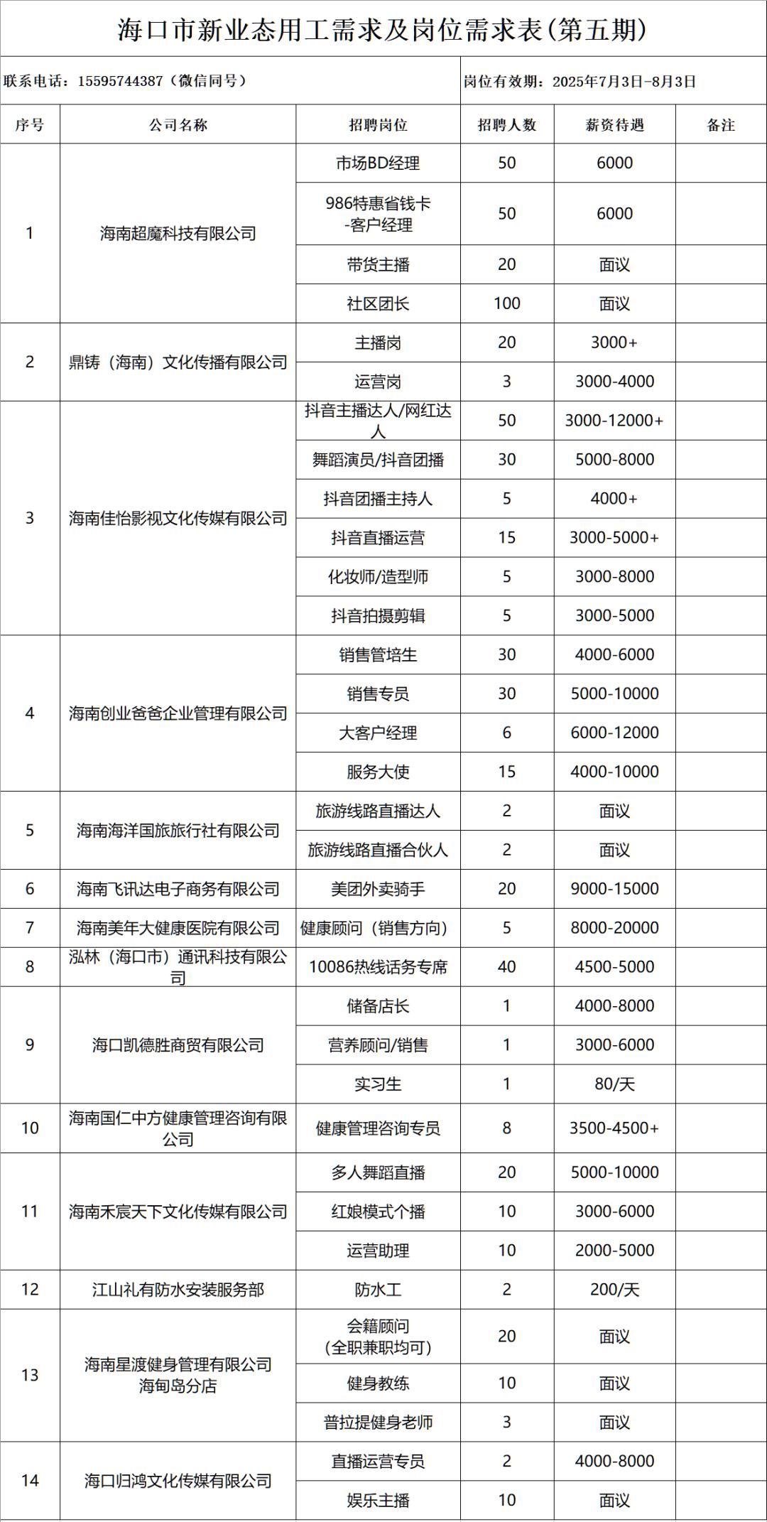 近日,海口市人力资源和社会保障局发布了海口市新业态就业需求和岗位需求表(第五期),方便众多申请人申请自己喜欢的岗位。本次招聘共有14家用人单位,包括通信、媒体、医疗、商业等多个行业,提供600多个岗位,如会话专席、娱乐主播、健康顾问、储备店长等。愿意求职的可以根据相关信息联系。
