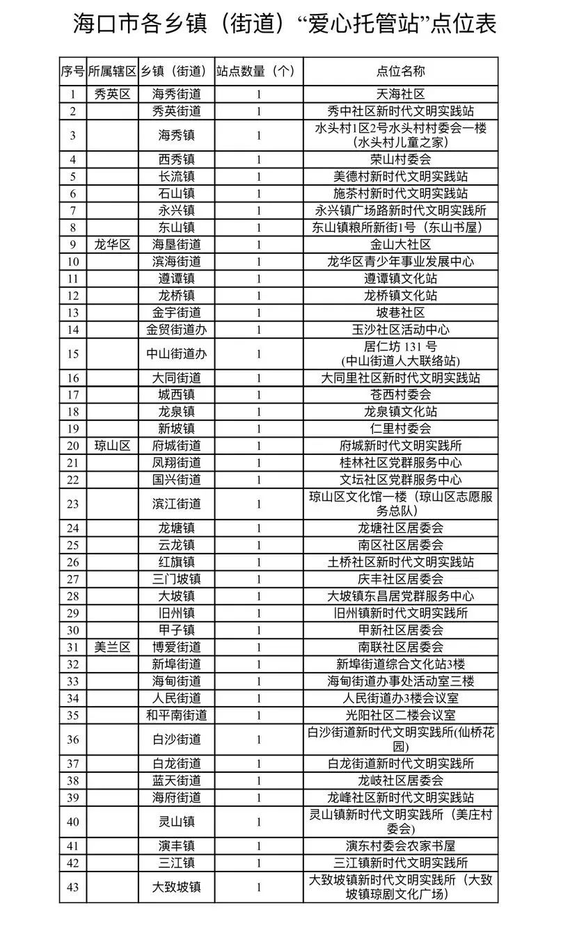 随着暑假的临近,海口市各团委近日启动了2025年海南省乡镇(街道)“爱心托管站”项目注册工作,为各镇(街道)招收6至12岁小学生。该项目将于7月7日至8月31日在全市43个镇(街道)同时开设“爱心托管站”,帮助孩子们度过一个安全、丰富、有价值的暑假。这次“爱心托管站”是一项公益活动,不收费。符合条件的学生家长可关注各团委微信微信官方账号获取报名信息并报名,按照报名顺序录取,并结合学生家庭实际需求。