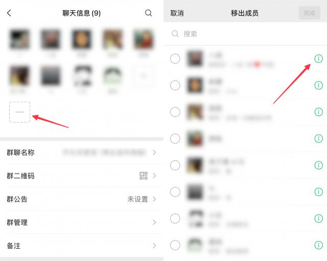 移除成员时,群主可以点击人名旁边的“ i “图标查看对方的详细信息,避免踢错。