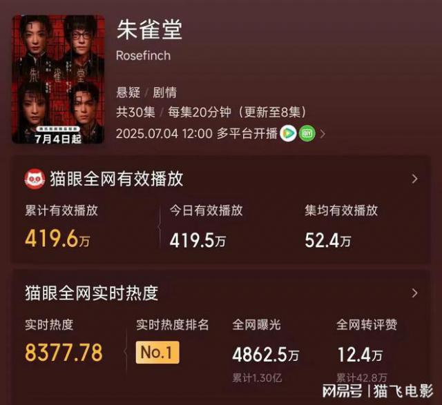 上线第一天,《朱雀堂》在猫眼短剧热度榜上排名第一,即时热度排名第一。