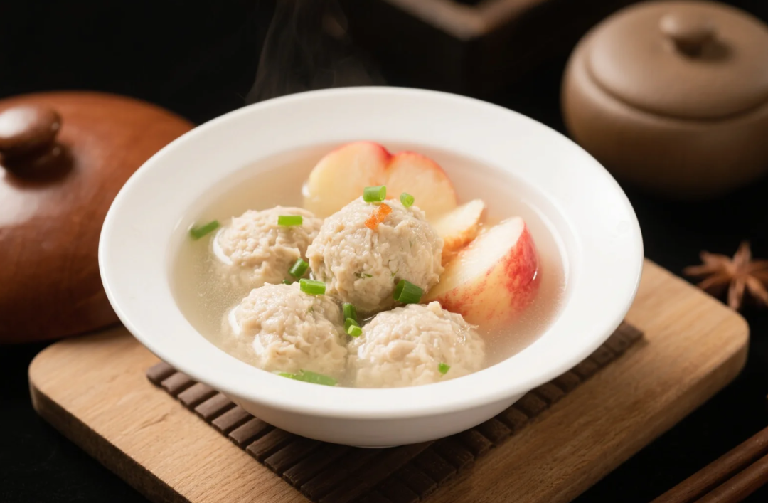 经典清炖狮子头中加入剁碎的桃肉,汤底加入桃胶。肉丸松软有果香,汤清味鲜甜。