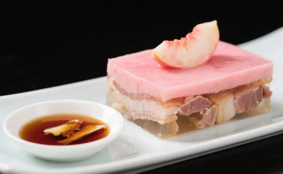 底层是传统的水晶菜肉冻,上层是用桃泥和吉利丁制成的粉红色桃冻。蘸姜醋汁吃,咸鲜与果甜碰撞。