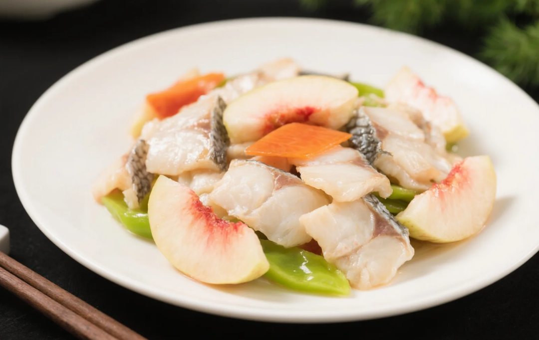 取黑鱼净肉切片滑炒,加入冰桃片状,鲜荷花瓣,淋白汁(鸡汤) 藕粉勾芡)。桃子清甜平衡鱼鲜,荷香点睛,盛夏极雅。