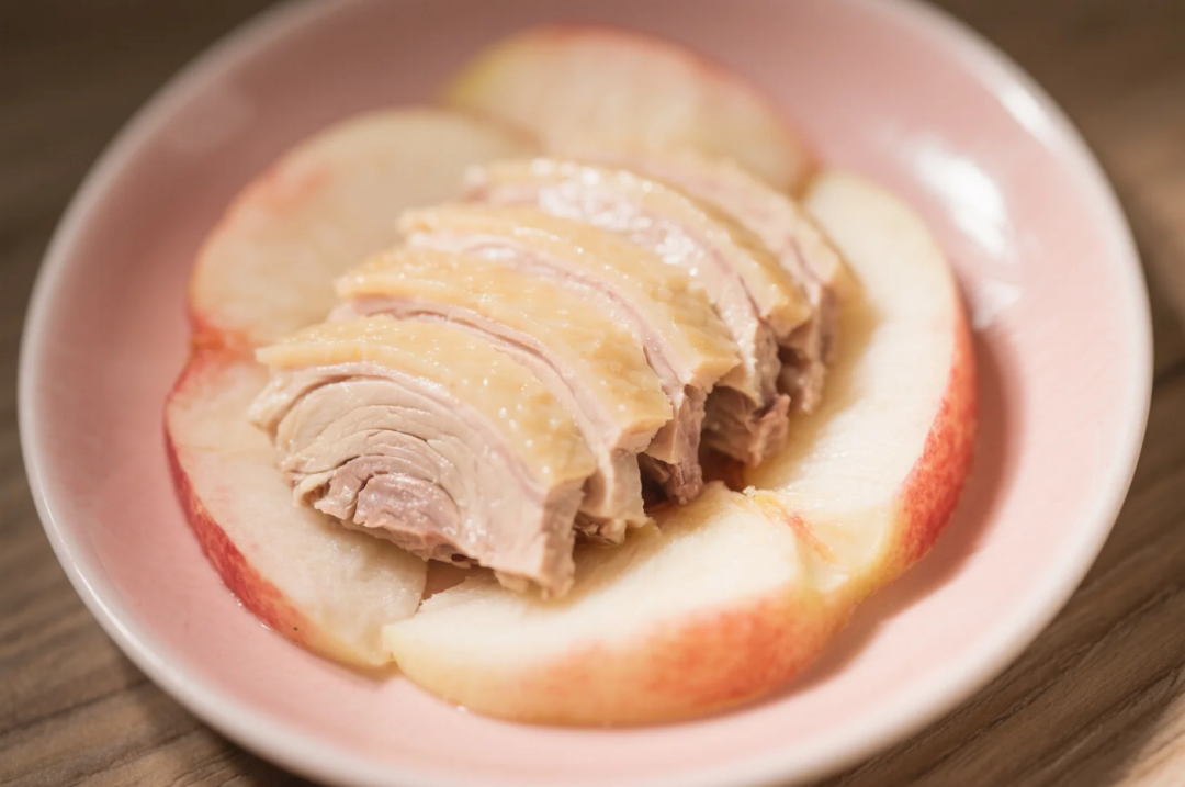 取盐水鹅胸片状,卷入冰镇桃肉条(去皮留淡红)、鲜嫩的生菜丝,薄荷叶,咸甜甘脆交织。