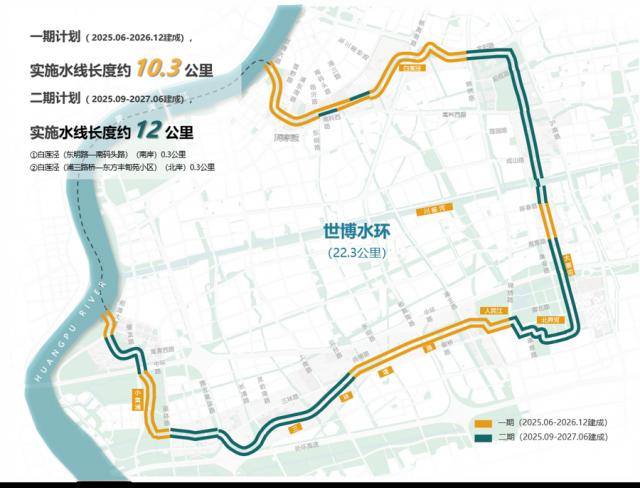 当前,世博水环一期工程已开工,计划 2026 年 12 每每月建成,实施水线长度约 10.3 公里。而且二期工程计划 2025 年 9 月动工,2027 年 6 每每月建成,实施水线长度约 12 公里。