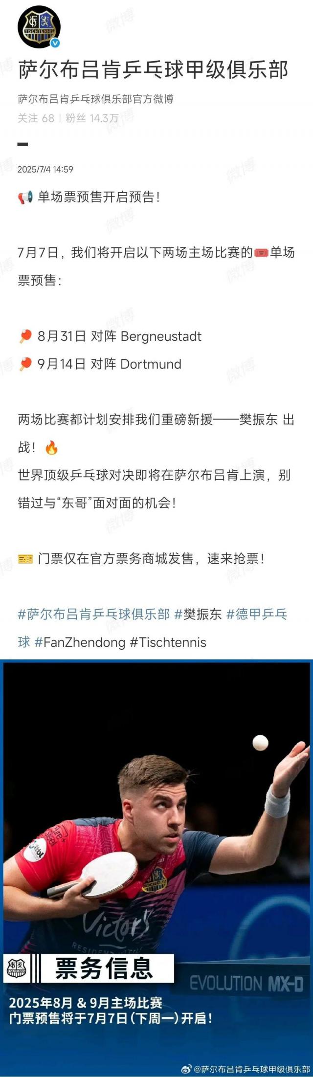 7 月 4 据德国萨尔布吕肯乒乓球甲等俱乐部报道, 8 月 31 日与 9 月 14 每天两场主场比赛都计划安排重新援助樊振东参加比赛。