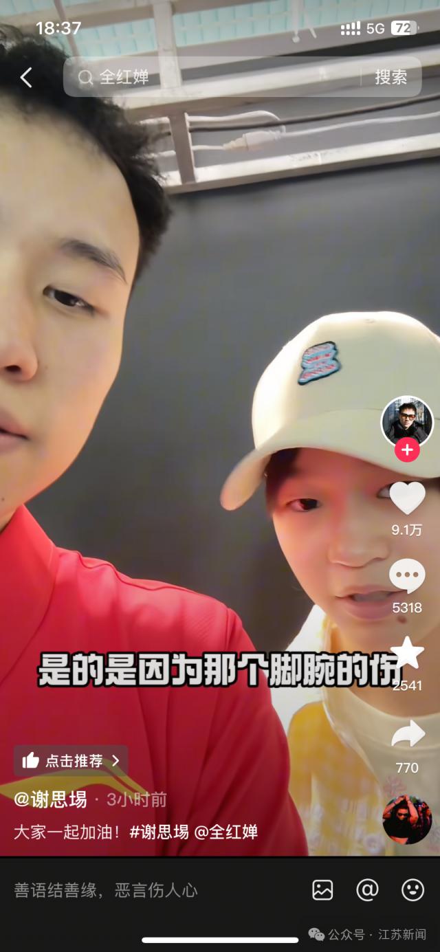 5 月 23 日本,中国跳水运动员谢思邈发布了一段与全红柒同框的视频。录像中全红柒为师哥加油,并对弃赛作出回应。
