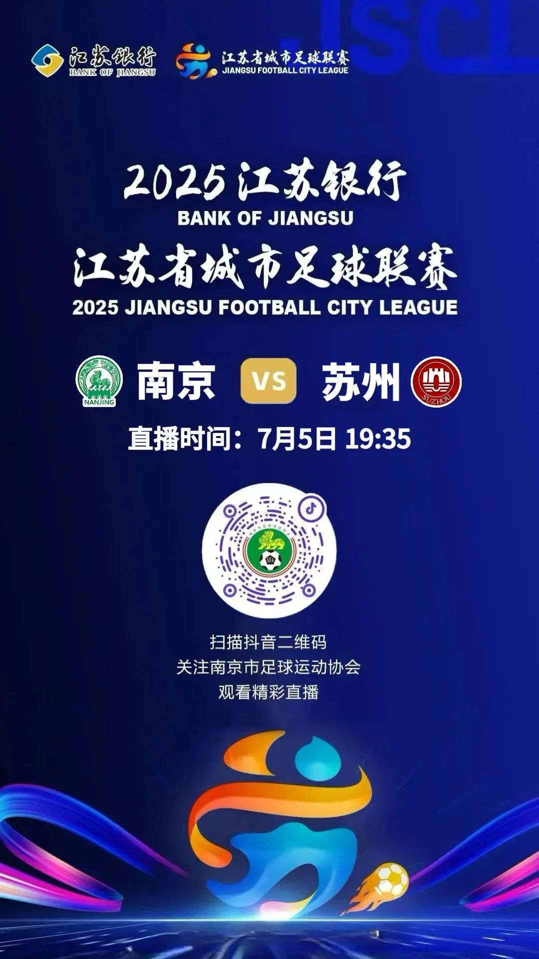 2025年江苏省城市足球联赛第六轮本周末,7月5日,南京队将在南京奥体中心体育场主场对阵苏州队。不能在场的球迷可以预约南京电视台的文化旅游记录频道和牛卡视频App。、抖音号“南京市足球协会”同步感受比赛热情。详细信息