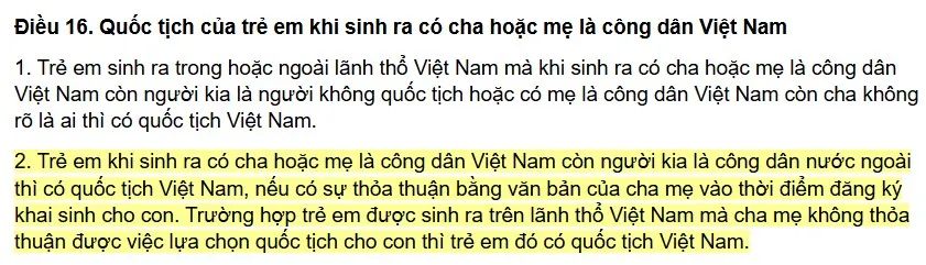 2. 父母一方是越南公民,另一方是外国公民生的孩子。如果父母在越南主管部门按照政府指导和办理出生登记手续时协商选择越南国家,孩子将能够拥有越南国家。如果孩子出生在越南,父母无法就孩子的国家达成共识,孩子将拥有越南国家。"