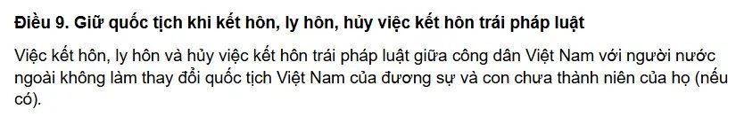 需要指出的是,《越南国籍法》第九条规定,“越南公民与外国人结婚、离婚、非法婚姻被撤销,当事人及其未成年子女(如有)不得变更的越南国籍。”这条规定这次没有改变。