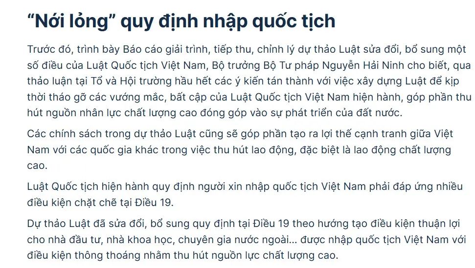 越南政府网站发表文章称,政策“放宽”入籍规定。此前,司法部长阮海宁表示,通过小组和会议的讨论,大多数意见同意制定这项法律,以快速消除现行越南国籍法的问题和缺陷,有利于吸引高质量的人力资源,为国家发展做出贡献。