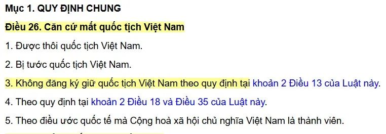 另外,法案第二十六条规定了失去越南国籍的几个原因: