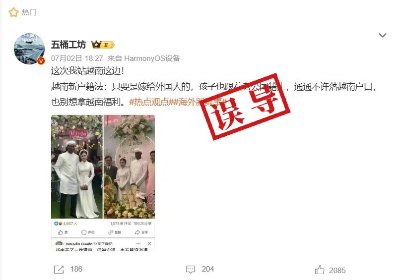 明查|越南出新规嫁给外国人一律取消户籍?不真实?