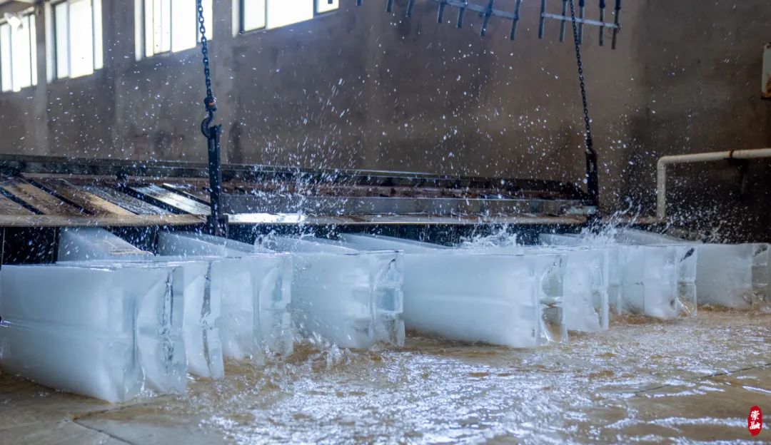 在上海长兴岛渔港有限公司冰厂生产间,记者看到一排排铁皮冰模正在机械化行驶,从冷却槽中吊起,然后冰模缓缓旋转,22块100斤重、晶莹剔透的大冰块滑出模具。这类模具在重新注满自来水后,将采用盐水冷凝法继续循环制冰,等待12小时左右即可完成新一轮制冰。出模后的冰块被工人用铁钩推到一边的旋转导轨上,在导轨出口处的工人再次将冰块包装车运到每一个冰库。