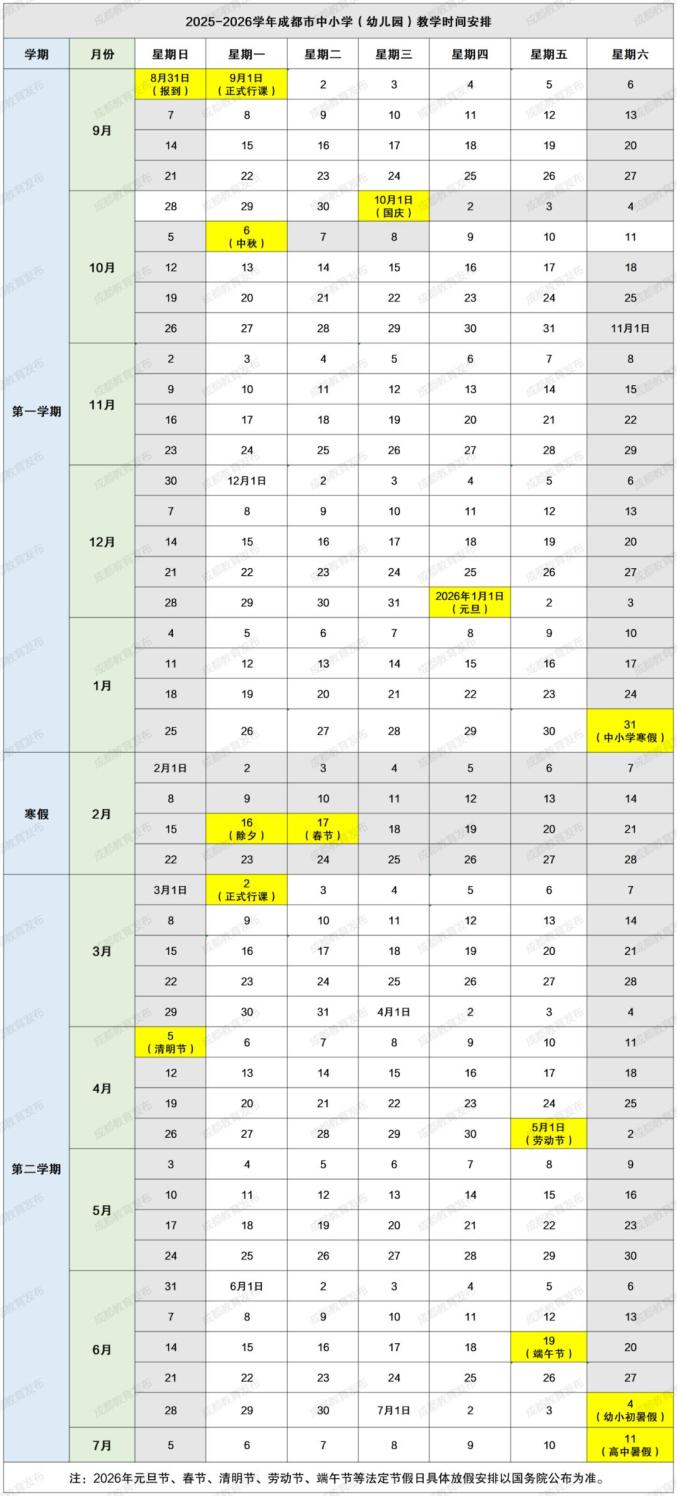根据国家规定的中小学课程设置和教学时间要求,教育部门确定了每学年义务教育阶段学校教学时间为39周,普通高中教学时间为40周。在此基础上,确定了每个学年的期末复习考试和寒暑假假期。2025-2026学年中小学第一学期期末考试安排在1月26日至30日,寒假安排在1月31日;第二学期期末考试安排在6月29日至7月3日,暑假安排在7月4日;普通高中期末考试安排在7月6日至7月10日,暑假安排在7月11日。