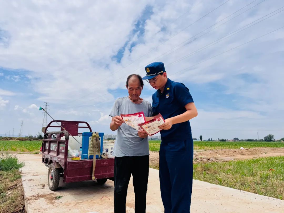 “师傅,田间工作千万不要抽烟,更不要烧秸秆。”“农机要定期检查路线!”.........在金色的麦田里,消防宣传人员和志愿者走得很慢,形成了一个“移动宣传队”,向村民普及了夏季收获和夏季种植期间引发火灾的原因、危害性和防火注意事项等消防安全知识。