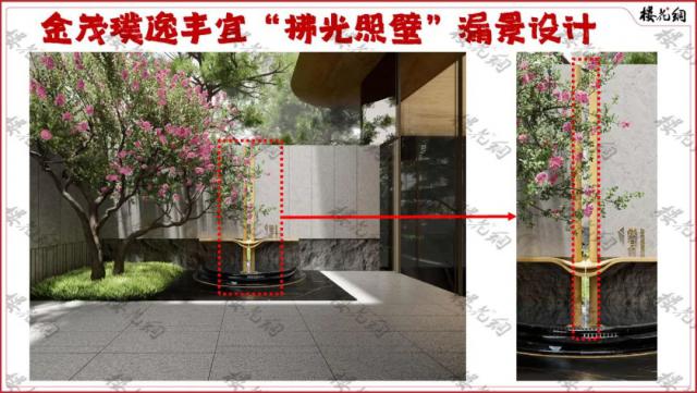 左下方是紫金硫璃墙, 3 平方米的漏空设计,正对着拂光壁。它是一种优秀的风水设计,为整个社区聚气,招财。