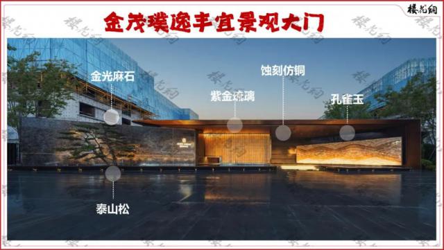 先从大门说起。左右两边,金色的麻石和巴西的孔雀玉呈八子形,覆盖着整面墙;中间是 460 取意大利佛罗伦萨教堂,每块紫金硫璃价值近万元,铺成金色玄关。