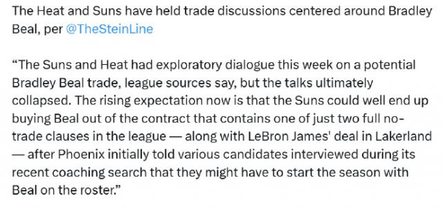 北京时间 7 月 5 日本,当艾顿和利拉德相继被买断时,自然是对比尔的太阳处理。名记 Marc Stein 据报道,太阳和热火已经失败了关于比尔的交易谈判,现在根据福布斯体育的说法。NBA 记者 Evan Sidery 报告显示,比尔还剩下 2 年 1.1 一亿美元的合同,他愿意配合太阳买断,从而帮助太阳绕过第二土豪线。