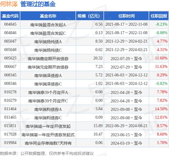 何林泽先生:中国国家,南开大学金融工程硕士,2011年 年 6 月 28 日至 2020 年 11 月 9 日,在兴证券资产管理有限公司固定收益部门担任固定收益研究员、投资主办和副总经理。 ;2020 年 11 月 10 日至 2021 年 4 月 14 日本担任建信信托有限公司上海证券业务部负责人。2021 年 4 月 15 日本加入南华基金管理有限公司,现在担任南华瑞泰 39 债券型证券投资基金基金经理每月定期开放。 ( 2021 年 4 月 28 日起就职 ) 、南华瑞泽债券投资基金主管基金 ( 2021 年 6 月 3 日至 2024 年 12 月 12 日就职 ) 、南华瑞利债券投资基金主管基金 ( 2022 年 3 月 28 日起就职,2021 年 9 月 8 日起至 2022 年 3 月 27 日本担任南华瑞利纯债券型证券投资基金主管,南华瑞利纯债券型证券投资基金转型为南华瑞利债券型证券投资基金 ) 、南华瑞鑫定期开放债券型发起式证券投资基金主管部门 ( 2022 年 7 月 29 日起就职 ) 、南华瑞元定期开放债券型发起式证券投资基金主管部门 ( 2022 年 7 月 29 日起就职 ) 、南华瑞富一年定期开放债券型发起式证券投资基金主管部门 ( 2023 年 6 月 15 日起就职 ) 。曾任南华瑞诚一年定期开放债券型发起式证券投资基金基金主管。