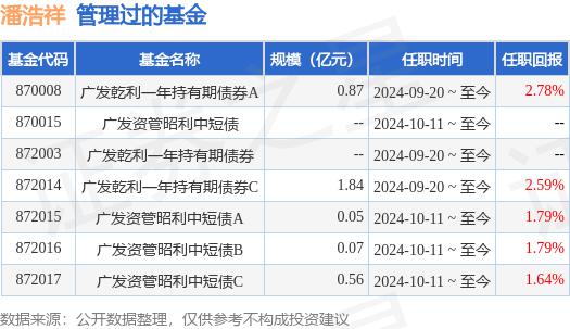 潘浩祥先生:中国籍,研究生,有中国证券基金行业从业证书。2016 年 4 月至 2017 年 8 2017年,月任平安证券有限公司固定收益部债券交易员, 年 9 每月加入广发证券资产管理 ( 广东 ) 曾任中央交易室债券交易员、债券交易主管、固定收益投资部投资经理助理、现任固定收益投资部投资经理的有限公司。2024 年 9 月 20 日起担任广发资产管理乾利一年持有期债券型集合资产管理计划的基金经理。2024 年 10 月 11 日起担任广发资产管理昭利中短期债券型集合资产管理计划基金经理。2025 年 5 月 20 广发资产管理弘利日起担任广发资产管理 3 个月滚动拥有债券型集合资产管理计划,广发资产管理增加6个月持有期债券型集合资产管理计划基金经理。