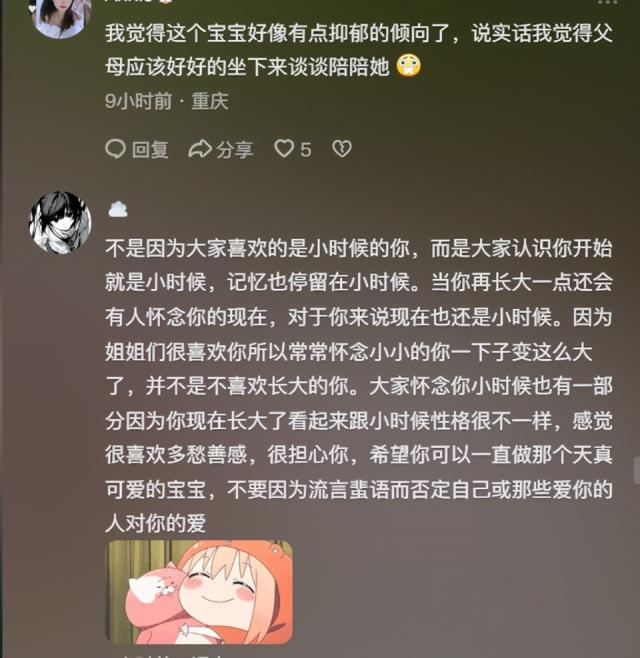 从甜馨发布的悲伤文案来看,她也觉得大家小时候都喜欢她,因为当时她很可爱,但是她觉得别人现在不会喜欢她,所以她觉得长大没有意义。