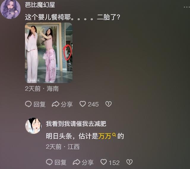 最近,她拍了一段视频,和甜心一起在家跳舞。然而,一些网民从这段视频的一个角落发现了线索。桌子旁边有一个疑似婴儿座椅的东西。理所当然,它不应该出现在这里,这引起了二胎的谣言。然而,仅仅靠一把椅子是无法判断李小璐感情的新趋势的。