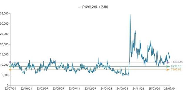 注:沪深交易所成交额彩色标记水平线分别为横轴统计日期范围内的成交额。 25%、50%、75% 分位线,只用于静态显示,不含任何投资建议。