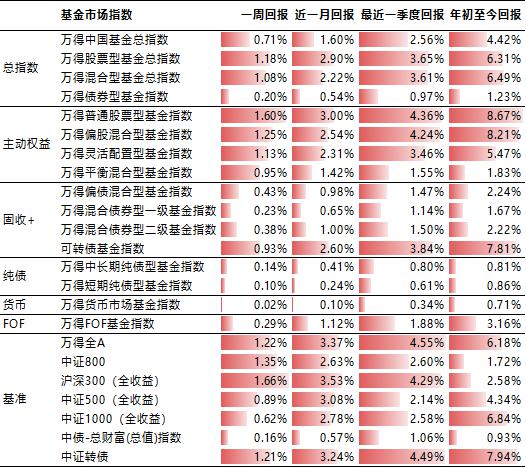 基金表现:上周万得全基指数上涨 0.71%。其中,万得普通股票基金指数上涨 1.60%,万得偏股混合基金指数上涨。 万得债券基金指数上涨1.25%。 0.20%。
