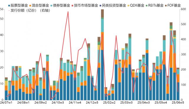 上个星期合计发行 20 只是,其中股票基金发行 11 只是,发行混合基金 5 只是,发行债券基金 3 只,FOF 型基金发行 1 只是,总发行份额 53.28 亿份。