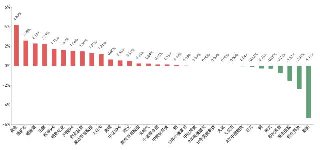 就资产类别而言,上周国际权益市场略有分化,美股持续上涨,英伟达市值接近 4 亿美元推动科技股上涨。欧洲市场略显劣势,反映了欧元区经济复苏乏力的隐患。亚洲权益市场表现不佳,日经济增长 225、韩国综合、恒生指数均小幅走弱,新兴市场整体表现弱于发达市场。