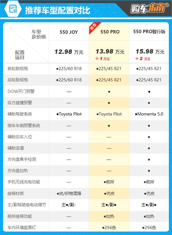 参考价为 13.98 万元的 550 PRO 这是这次推荐的车型。通过配置对比可以看出,与入门级车型相比,推荐车型的安全配置再次提升,增强了。 DOW 开门警告和后方碰撞警告。此外,还增加了副驾驶座椅电动调节、前排座椅加热、前排手机无线充电等基本功能。座椅材料也升级为仿皮材料,可以有效增加日常车辆的舒适性和便利性。另外,推荐车型的轮毂也使用了 21 大尺寸的轮毂,视觉效果更好。价格仅比入门级车型多得多。 10000 人民币,绝对物超所值,性价比极佳。