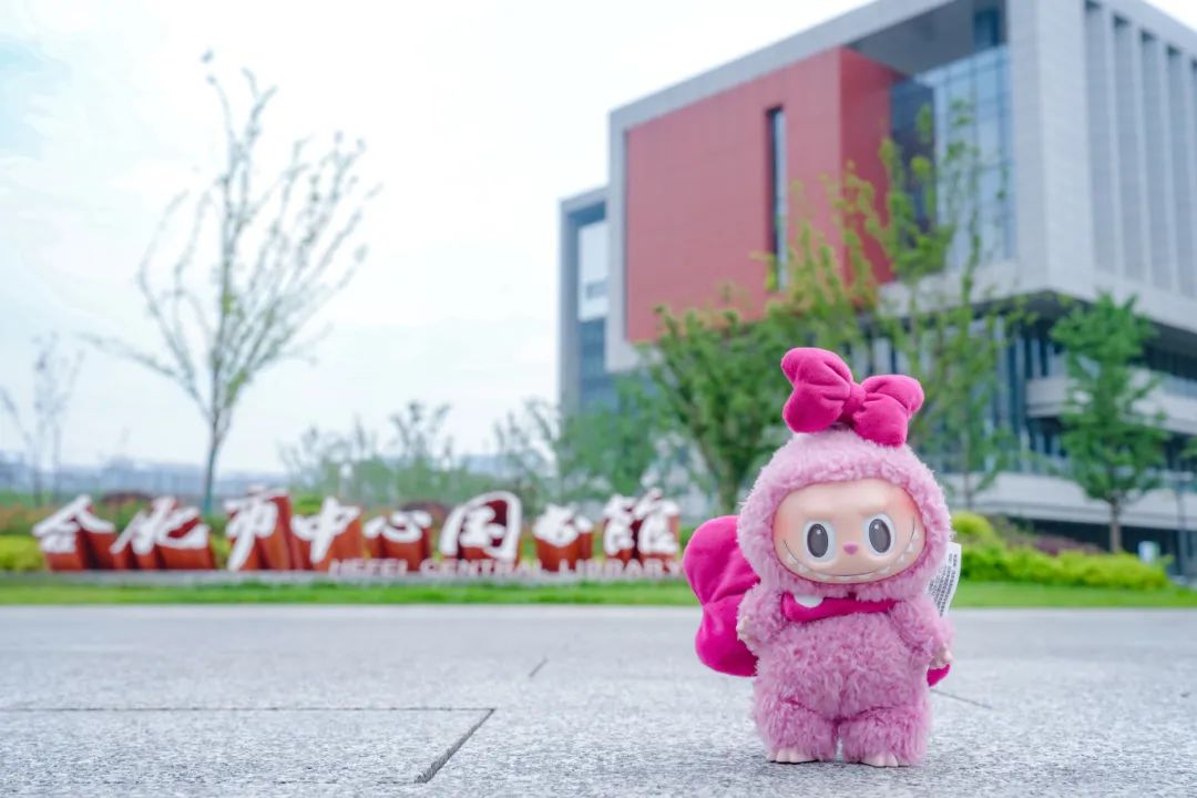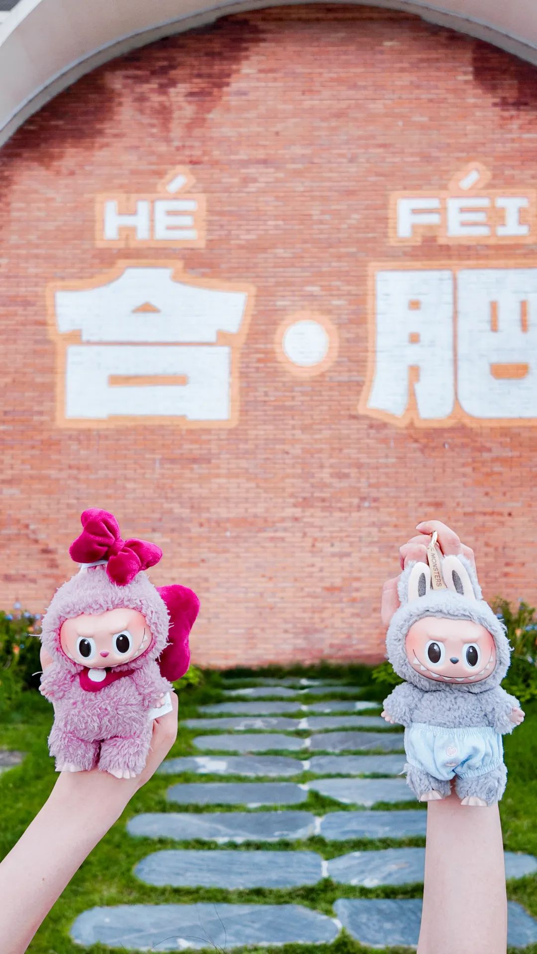 泡泡玛特家族在“合肥”红墙前凹出各种造型。